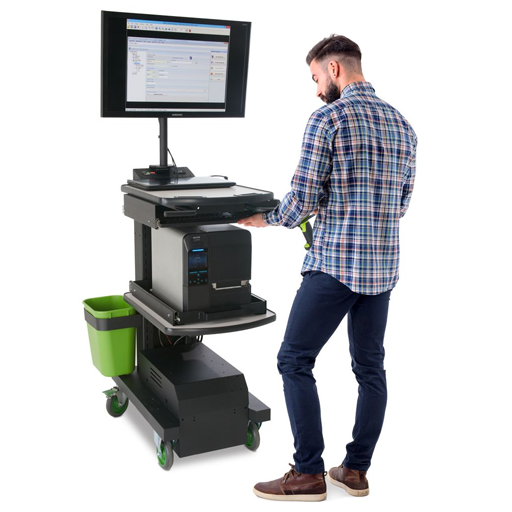 Carrito industrial con ruedas y accesorios que permite dar movilidad en la impresión de etiquetas y en la energización de herramientas de trabajo como lap-tops, tablets, thin clients, pantalla lcd, lector de código de barras, etc., ideal para industrias o almacenes que requieren flexibilidad en sus operaciones.